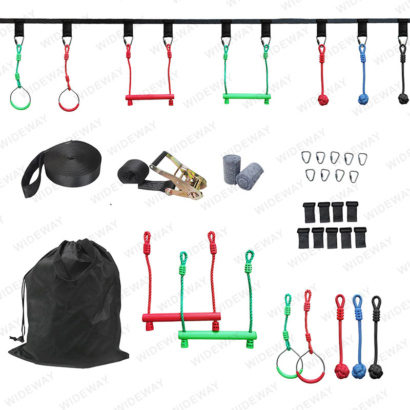 Kursus halangan Slackline 15m dengan Ratchet mencipta cabaran dinamik, sementara lampiran halangan serba boleh membolehkan anak -anak memanjat, mengayunkan, dan mengimbangi cara mereka ke penguasaan Ninja.
